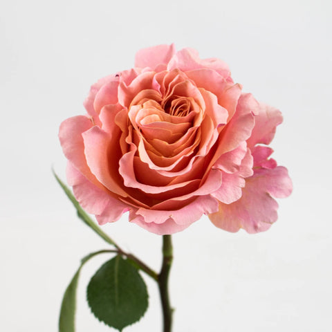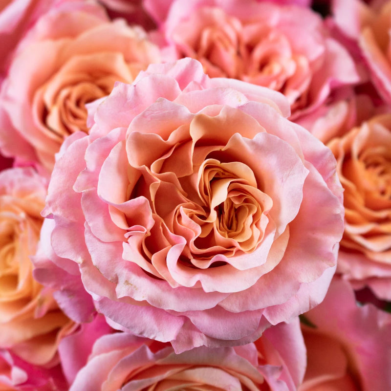 Peony Rose Peach Ruffles is a ruffled peach of a flower. Full headed, dense petaled and sweet scented, you cannot go wrong with a rose like this. This rose will arrive with its lighter pink petals stealing the show, but once it blooms open you'll see the darker pink and peach tones come in. Use these delicious rose for a bridal shower, luxurious wedding or just because. Bunched together these blooms make a stunning bouquet, but you can also add ranunculus, hypericum berries and greens for a truly fairytale arrangement.