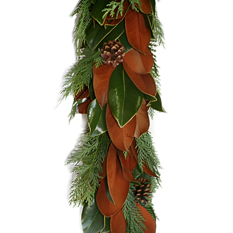 This garland features a combination of fresh magnolia leaves, leyland cypress, and pinecones.