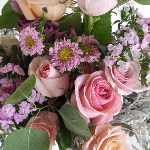 Suggested Flower Recipe For One Bouquet: 1 pink mondial, 1 shimmer rose, 1 cool water, 1 arlene rose, 1 white mini calla, 1 cream spray rose, 1 light pink matsumoto, 1 light pink dianthus, 1 silver dollar eucalyptus, 1 green lily grass or leather leaf, 1 dusty miller or green succulent.