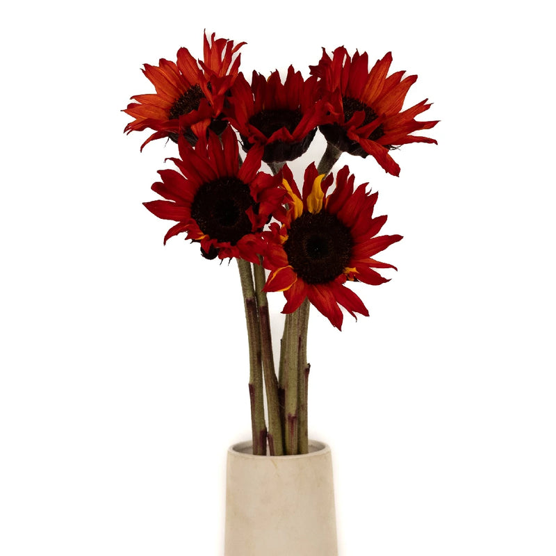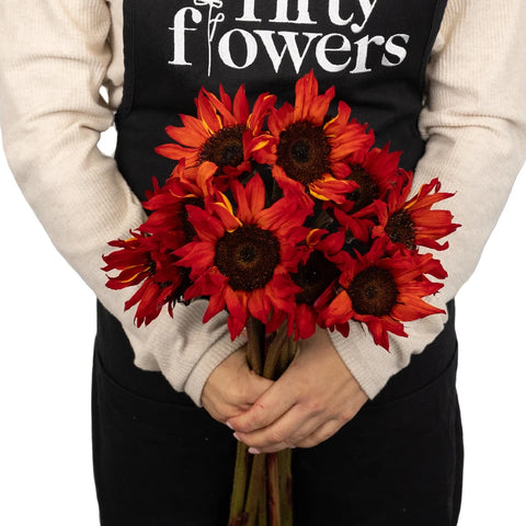 These extraordinary Red Tinted Sunflowers are the perfect choice for any outdoor event, infusing a delightful informality into your surroundings. Imagine the vivid charm they would bring to your wedding bouquet, imbuing it with a pop of passionate red. Picture them as the focal point of a table centerpiece, radiating warmth and joy to all who gather around. These sunflowers are not merely flowers; they're a statement of life's vibrancy and beauty.