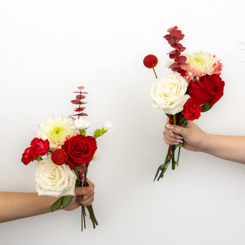 Suggested Flower Recipe For One Bouquet: 1 tinted red cremon, 1 red rose, 1 white rose, 1 red mini carnation, 1 white mini carnation, 1 red glittered billy ball, 1 white glittered swirls, and 1 tinted red baby eucalyptus.