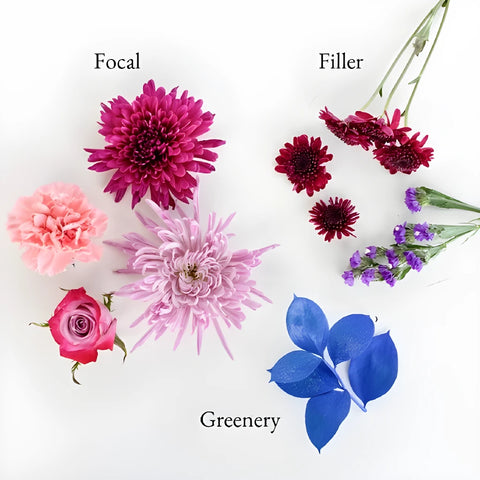 Suggested Flower Recipe For One Bouquet: 1 pink tipped lavender rose, 1 purple cremon, 1 lavender spider mum, 1 pink carnation, 1 purple statice, 1 purple poms, and 1 blue glittered ruscus.