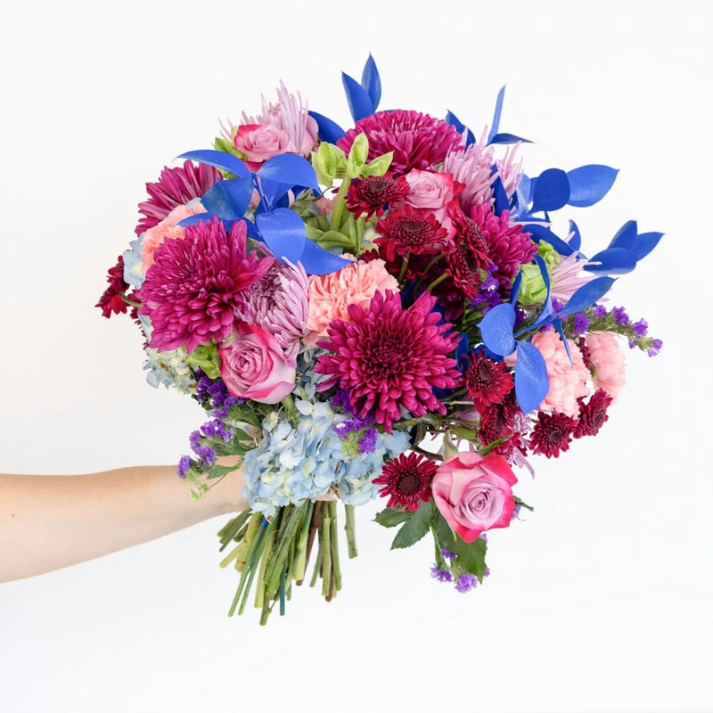 This DIY Flower Kit features growers bunches of pink tipped lavender rose, purple cremon, lavender spider mum, blue hydrangea, pink carnation, purple statice, purple poms, blue glittered ruscus, and green bells of ireland.