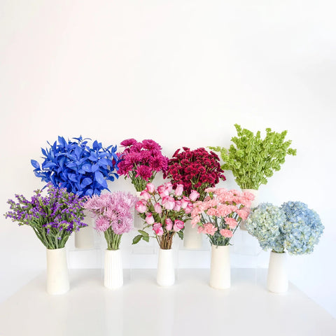 Tinted Flowers: If your kit contains tinted flowers, they may release color into the water, which is perfectly normal. To keep the water clear and clean, be sure to change it regularly. Tinted water can also stain surfaces, so be cautious. The dye may transfer to skin or clothing, so we recommend wearing gloves while handling. For added protection, especially with clothing like a white wedding dress, wrap the stems to prevent dye from transferring.