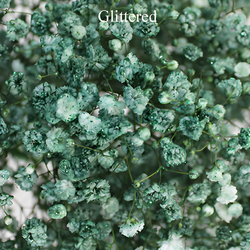 Glitter can be added to your Baby's Breath for an additional charge. Glittered Baby's Breath is a solid tinted flower with an added application of glitter.