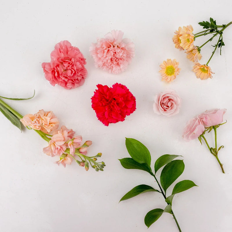 Suggested Flower Recipe For One Bouquet: 1 light pink carnation, 1 dark pink carnation, 1 medium pink carnation, 1 pink spray roses, 1 dark pink pom novelty, 1 pink stock, and 1 green ruscus.