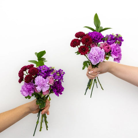 Suggested Flower Recipe For One Bouquet: 1 light purple carnation, 1 dark purple carnation, 1 fuschia purple carnation, 1 purple spray roses, 1 purple novelty pom, 1 purple stock, and 1 green ruscus.