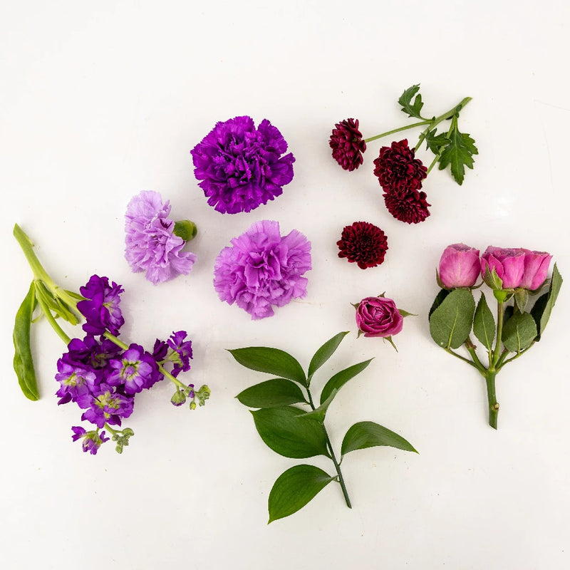 This Flower Bar Kit features growers bunches of light purple, dark purple, and fuschia purple carnations, purple spray roses, purple novelty pom, purple stock, and green ruscus.