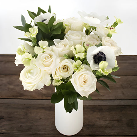 Each bouquet features a harmoniously hand-crafted arrangement of white anemones, snowbliss rose, white ranunculus elegance, solomio, and green ruscus.