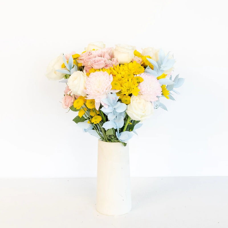 Each bouquet features a harmoniously hand-crafted arrangement of white rose, tinted ombre pink disbud, pink spray rose, yellow button, yellow daisy, and tinted light blue ruscus.