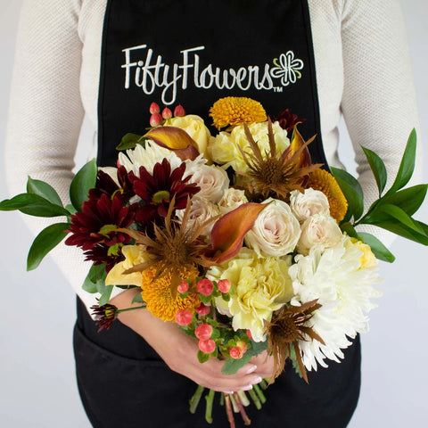 FiftyFlowers is proud to take full responsibility for the quality of your properly cared-for flower shipment. Please read our Full Guarantee for more information.