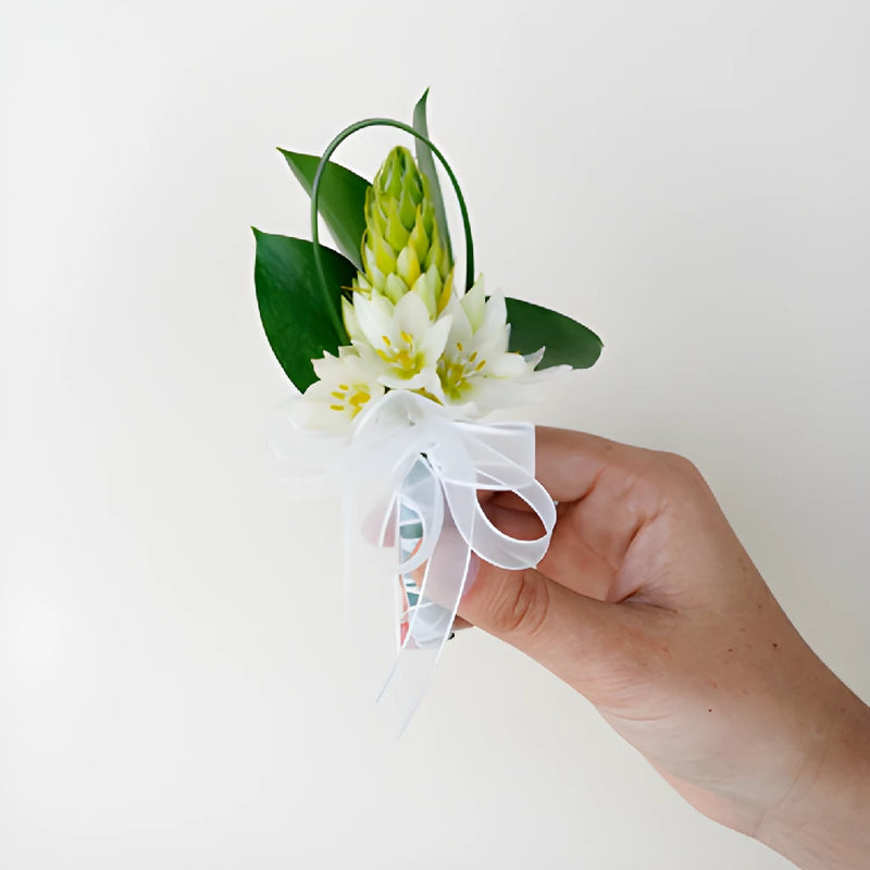 - Each Pin-on Corsage Features: 1 Star of Bethlehem adorned with Israeli ruscus greenery and a lily grass loop, wrapped with a white ribbon. White headed pins included.