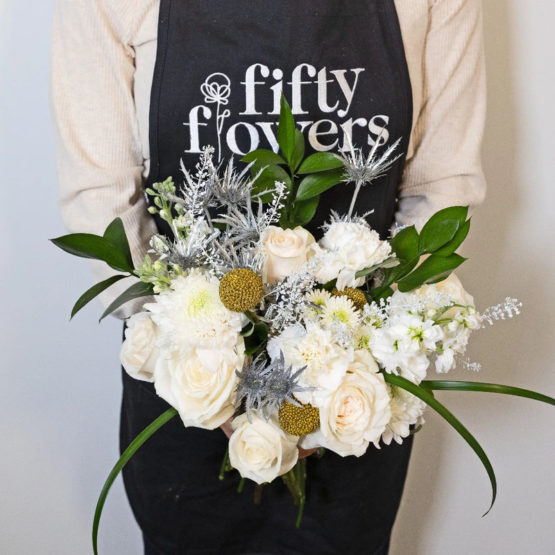 - Large centerpieces will each have 45 total flower stems - pictured in the hand and apron above.