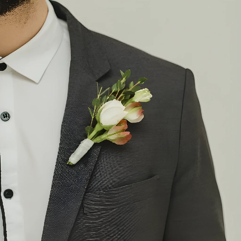 - Boutonnieres Feature: Pink alstroemeria, gunnii eucalyptus, and white spray roses.