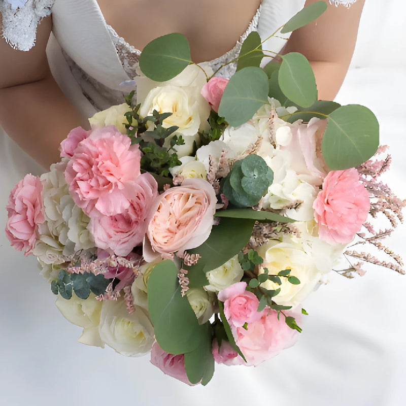 - Bridal Bouquet Features: 38 total stems of pink carnation, baby eucalyptus, silver dollar eucalyptus, gunnii eucalyptus, pink garden roses, light pink garden roses, white hydrangea, pink mini carnation, light pink roses, white roses, and light pink limonium.