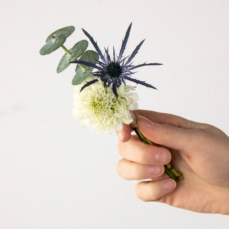 "Something borrowed, something blue" comes to life in this classy wedding flower collection. A wedding bouquet has been carefully crafted out of timeless white flowers like assorted fresh roses and scabiosa. Pops of blue thistle add color and unique texture to the arrangement, while various types of eucalyptus create a backdrop of lush greenery. This collection also comes with a matching blue and white flower boutonniere! For chic and stylish elopements, this elegant and versatile wedding package is everything you need to keep your wedding flowers simple and beautiful. When you order flowers online, we will send beautiful blooms right to your door, fresh from our farms. Our flower delivery makes it easy to receive ready-to-go wedding flowers before your big day!