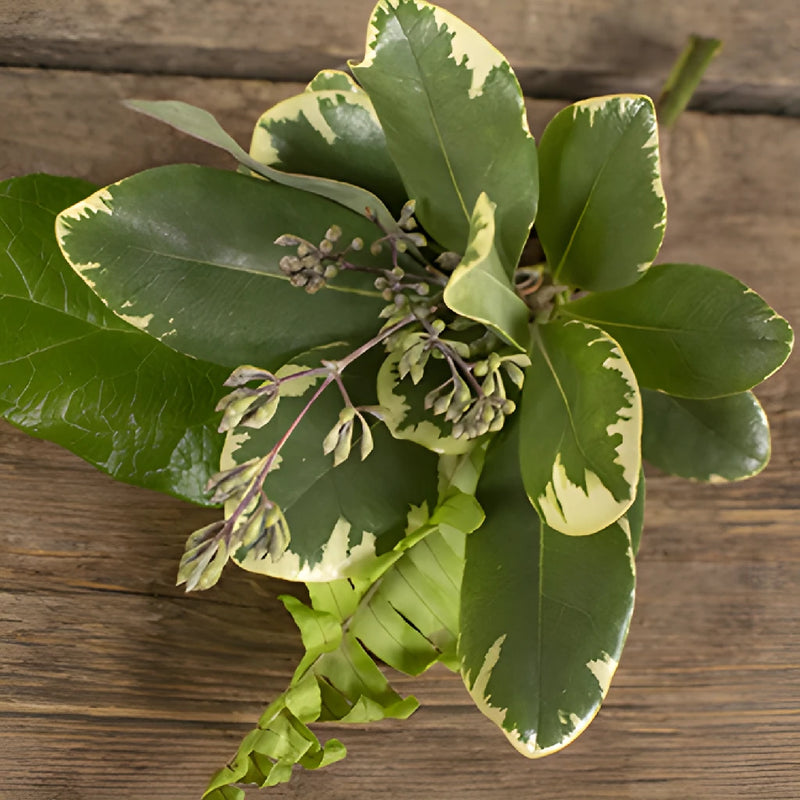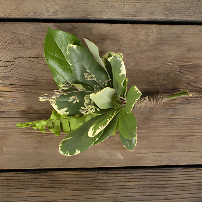 Boutonniere Features: Sword fern, variegated pittosporum, and naked seeded eucalyptus, wrapped with jute string.