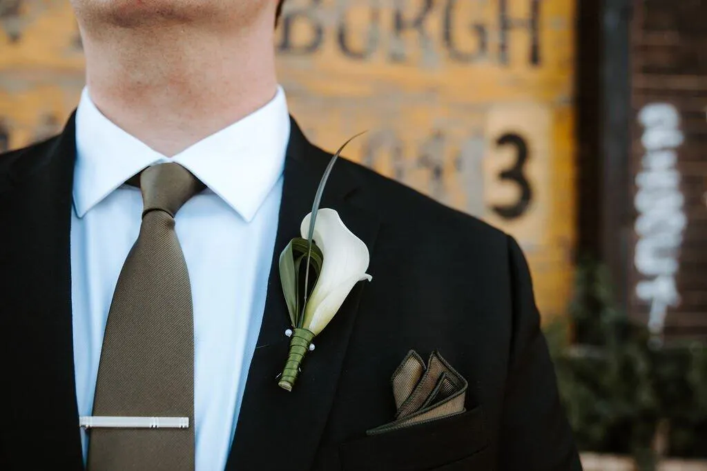 - Each Boutonniere Features: 1 White Mini Calla Lily paired with Lily Grass Greenery. White headed pins included.