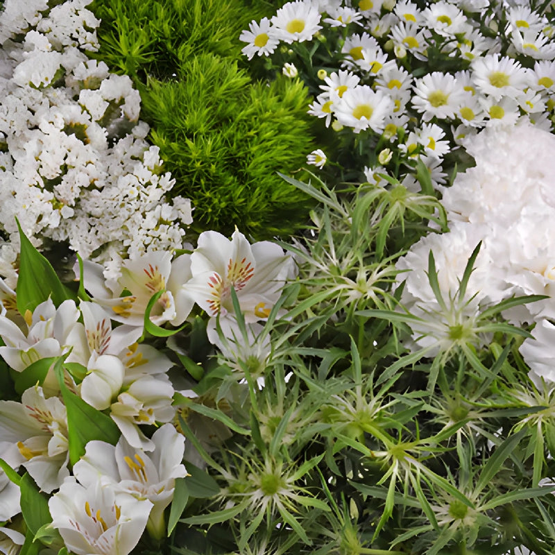 White Textured Filler Flower Pack is a mix of pure white flowers and green trick and green thistle to give much needed texture. Thistle, statice, aster, alstroemeria, carnations, and green trick make to add volume and sensational deep green colors. Make your guest feel like they are in a dreamy with this enchanting White Textured Filler Flower Pack.