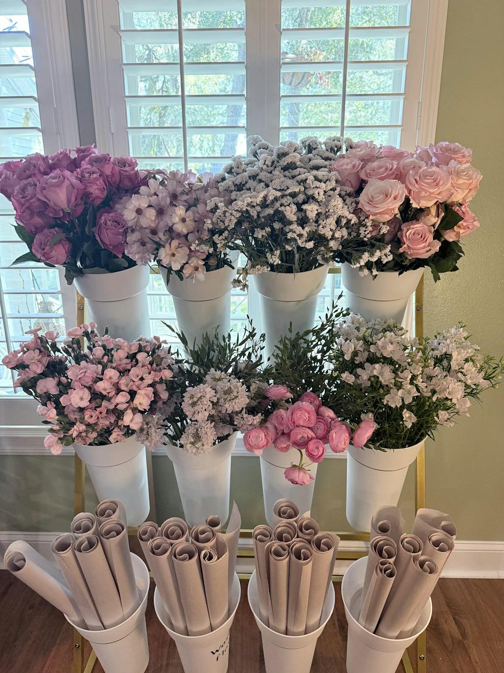 This DIY Flower Kit features growers bunches of pink ranunculus, light pink & dark pink rose, pink butterfly ranunculus, pink scabiosa, blush statice, pink solomio, pink delphinium, and parvifolia eucalyptus.