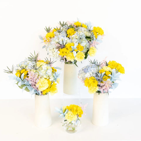 Each centerpiece features a harmoniously hand-crafted arrangement of blue hydrangea, yellow carnations, yellow buttons, yellow daisies, blue thistle, tinted pink solidago, and blue glittered ruscus.